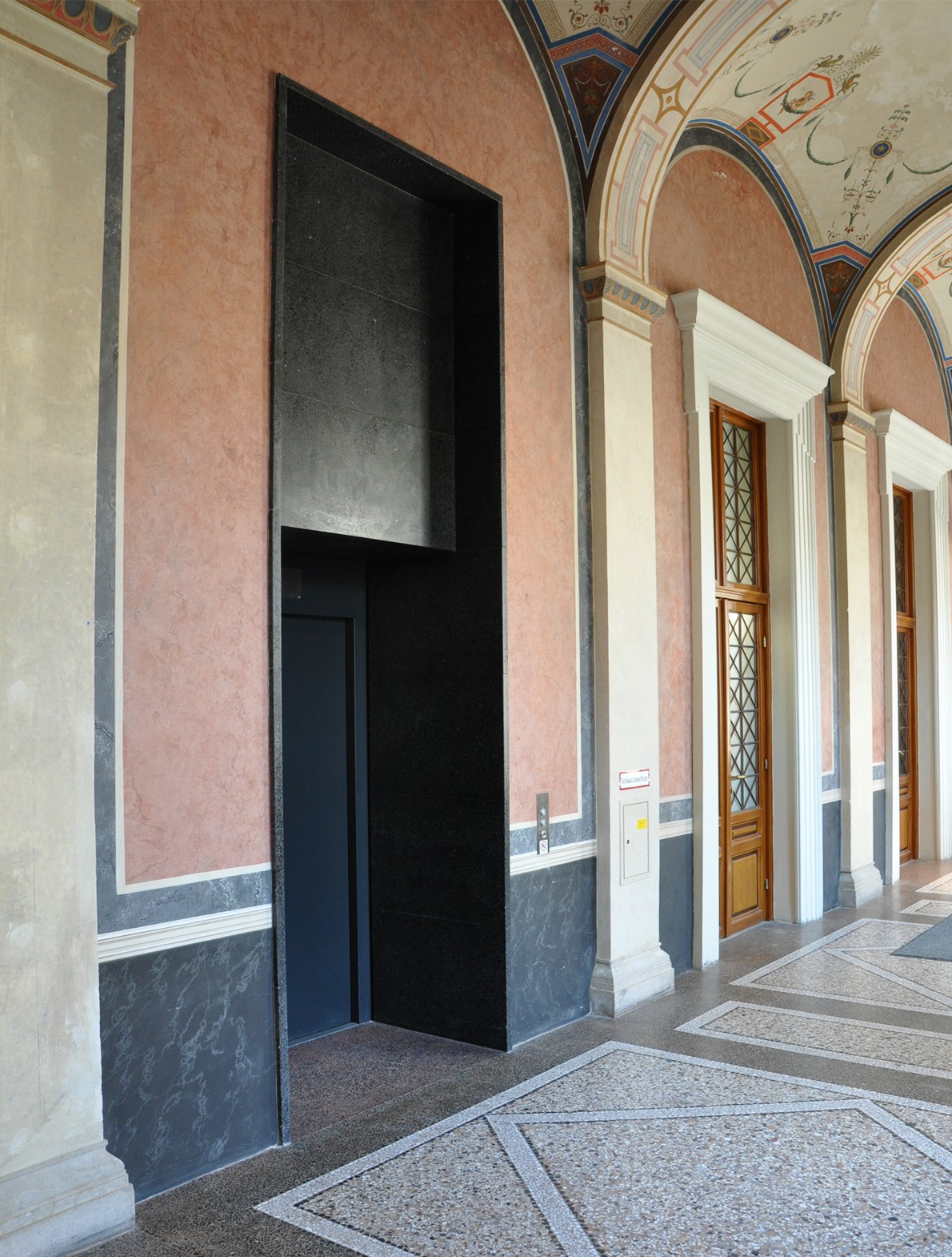 PROJEKTBESCHREIBUNG | Im Vorgriff auf die geplante Generalsanierung der Akademie der bildenden Künste Wien wurden dringend erforderliche Maßnahmen zur Verbesserung der Gebäudesicherheit umgesetzt. Dazu zählen der Einbau eines Feuerwehraufzugs und einer Lastenaufzugsanlage, die Ausstattung der gewendelten Stiegenhäuser mit Druckbelüftungsanlagen sowie die Unterteilung des Gangs durch verglaste Rauchschürzen mit Rauch- und Wärmeabzugsanlagen. Ergänzend wurden zwei neue Stiegenhäuser zur besseren Erschließung der Ateliers im Dachgeschoss eingebaut und die Stromversorgung durch die Errichtung eines unterirdischen Traforaums sichergestellt.