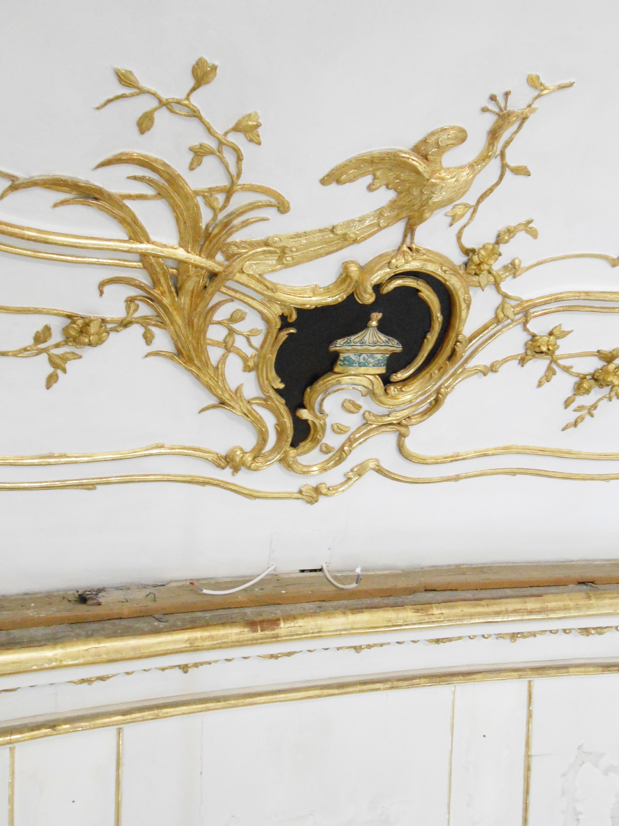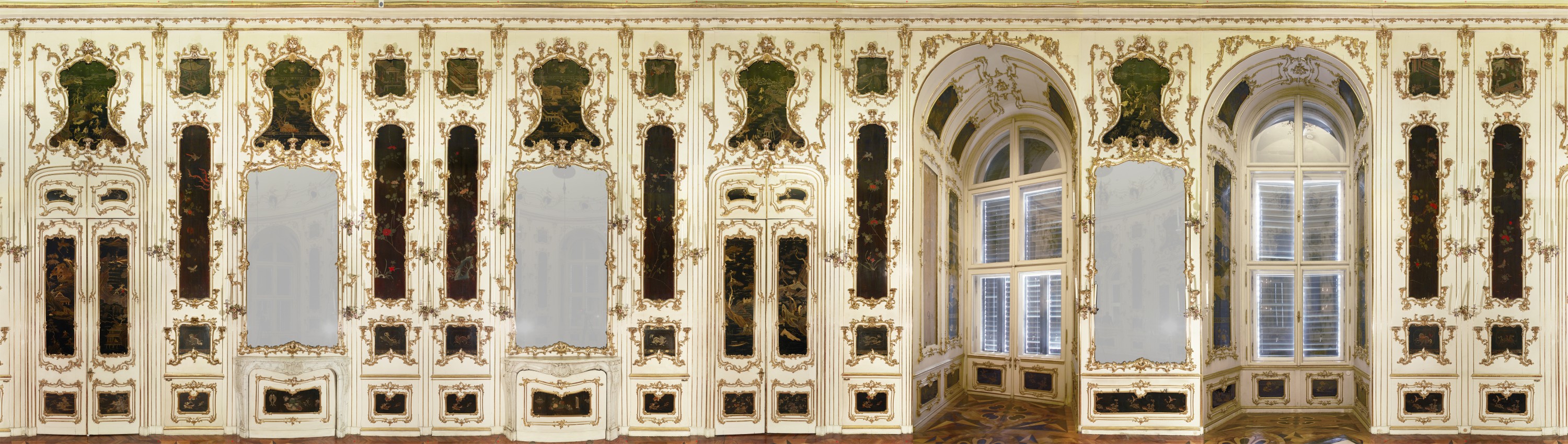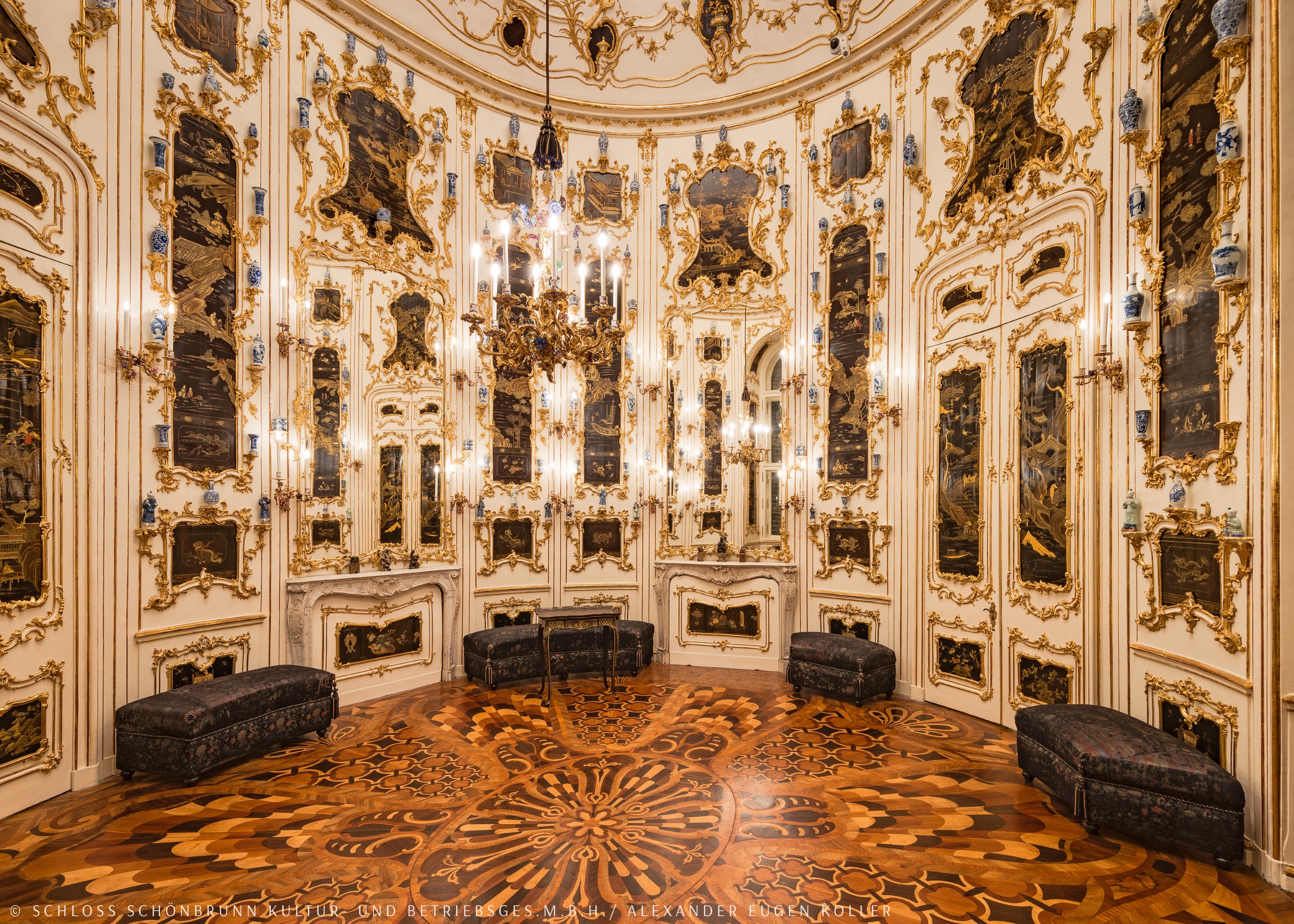 PROJEKTBESCHREIBUNG | Die Restaurierung der chinesischen Kabinette erfolgte im Zusammenhang mit dem FWF-Forschungsprojekt "Ostasiatische Raumausstattungen in Schloss Schönbrunn" mit der Zielsetzung der Erforschung von Objekt- und Restaurierungsgeschichte, Bestand- und Schadensdokumentation sowie die Entwicklung eines neuen Montagekonzepts der wandgebundenen Keramik. Zusätzlich betroffen waren die in die Wandvertäfelung eingebundenen chinesischen und japanischen Lacktafeln. Die Untersuchungen führten zu den Definitionen der Restaurierziele und bildeten die Grundlage zur weiteren Bearbeitung. Die Restaurierung der Weißgold- Wandvertäfelung sowie der Stuckdecke wurde entsprechend der definierten Restaurierziele umgesetzt. Die Metallapplikationen an Luster und Wandappliken in Form von Blütenblättern wurden getreu dem historischen Vorbild rekonstruiert.