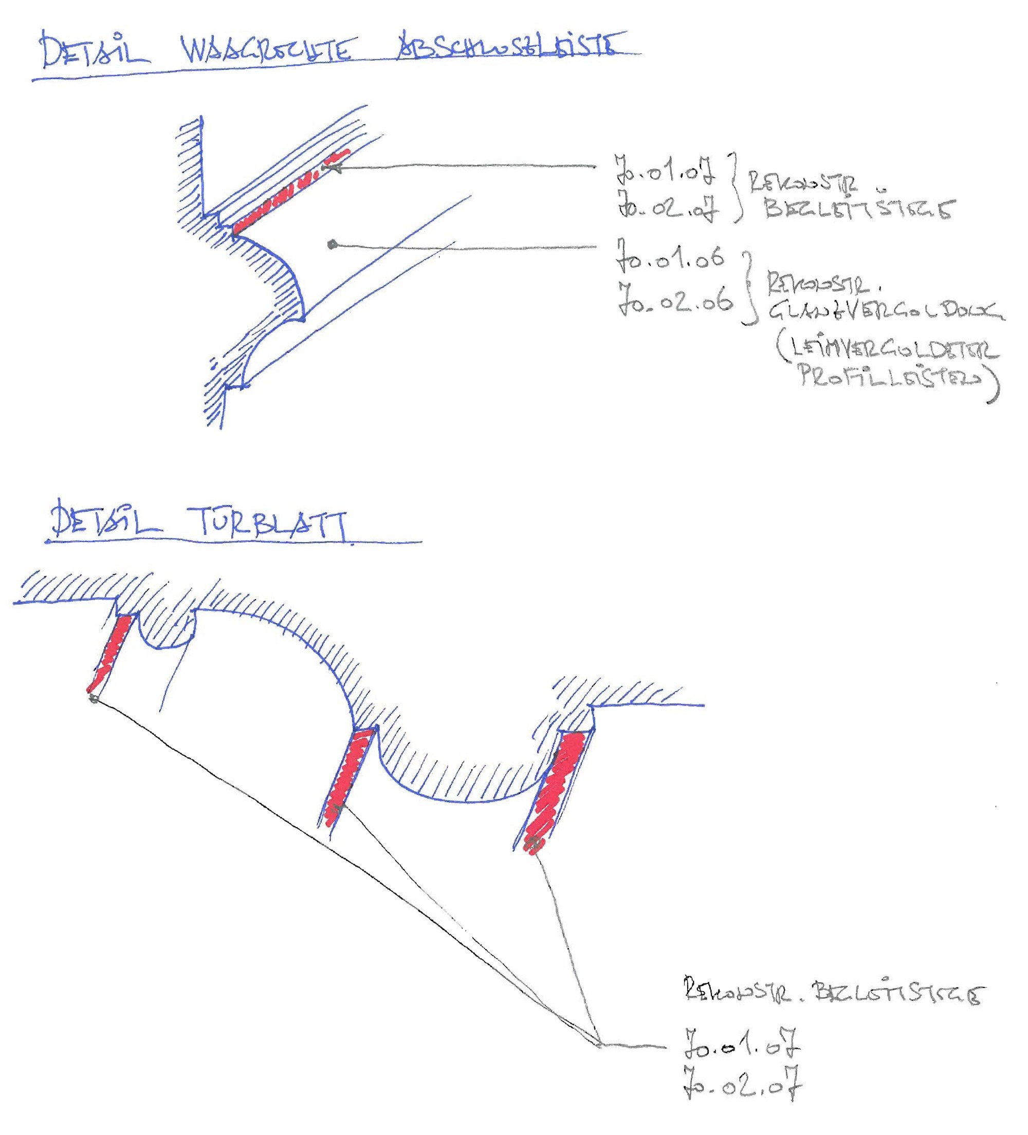 PROJEKTBESCHREIBUNG | An den Wandflächen der Vertäfelungen erfolgten Festigungsarbeiten, Schließen von Risse im Holzträger und im Anschluss das Streichen dieser vorbereiteten Flächen. An den vergoldeten Profilierungen wurden fehlende Vergoldungen entsprechen der Befundung rekonstruiert. An der Deckenfläche wurde die Bestandssicherung des Stucks, die Fixierung gelockerter Teile, ein Neuanstrich sowie die Restaurierung der Vergoldungen umgesetzt. Ergänzend führte man am Tafelparkett konstruktive und konservatorische Maßnahmen durch. Unter anderem sind Metallteile wie Fenster- und Türbeschläge und der Kachelofen gereinigt und konserviert worden.