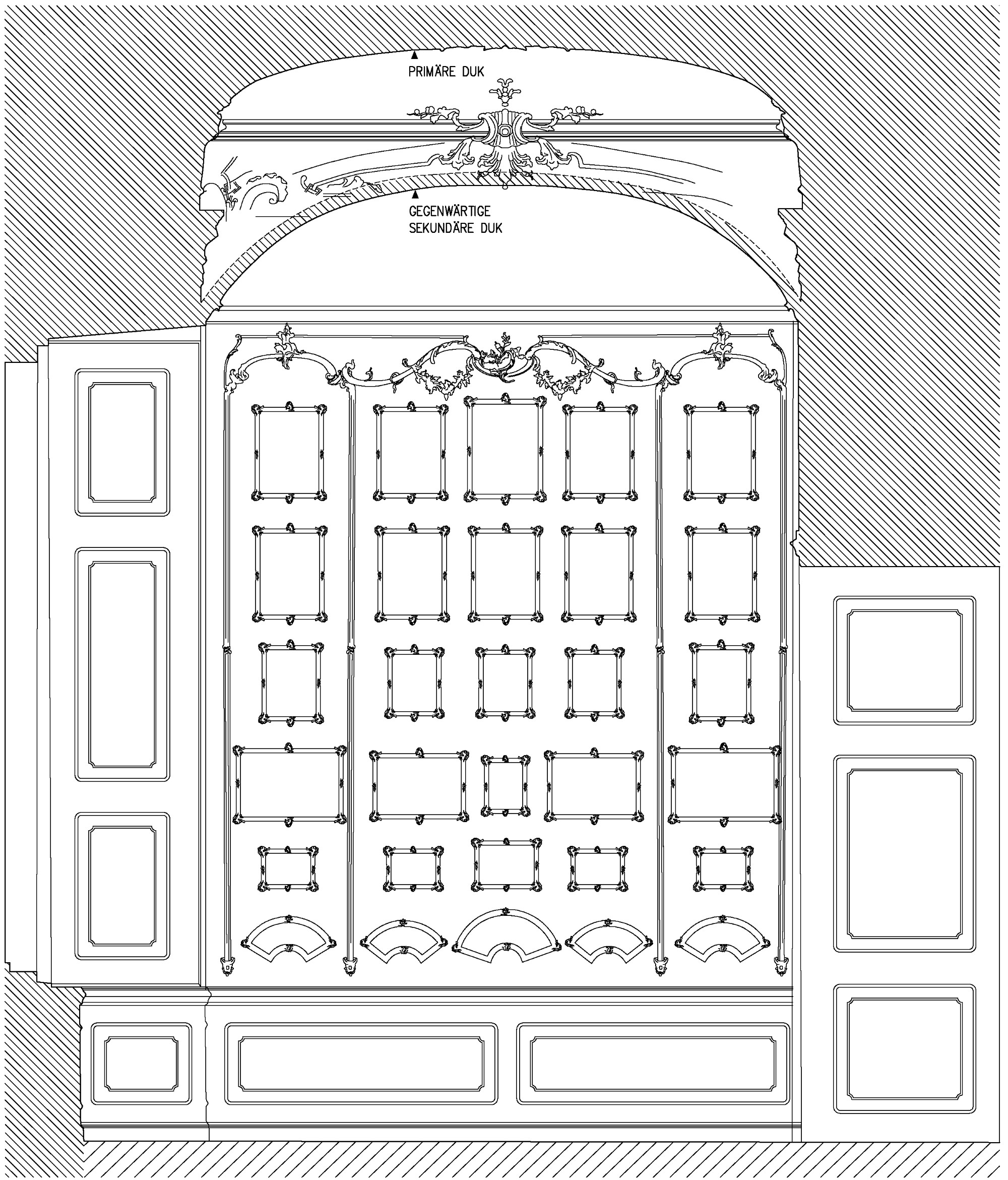 PROJEKTBESCHREIBUNG | Im Zuge der Restaurierung der Wand- und Deckenoberflächen sind die in der Wandfläche eingelassenen Miniaturen von Papierrestaurator*Innen konserviert worden. Bei der Durchführung wurde ein Deckenhohlraum entdeckt. Die Dokumentation der vorgefundenen ursprünglichen Deckenuntersicht, die vermutlich auf Fischer von Erlach zurückgeht, als auch die sekundäre Konstruktion erfolgte mittels Photogrammetrie. Die Aufnahme der primären Deckenuntersicht geschah zerstörungsfrei durch eine bereits vorhandene kleine Öffnung in der rezenten Deckenkonstruktion.
