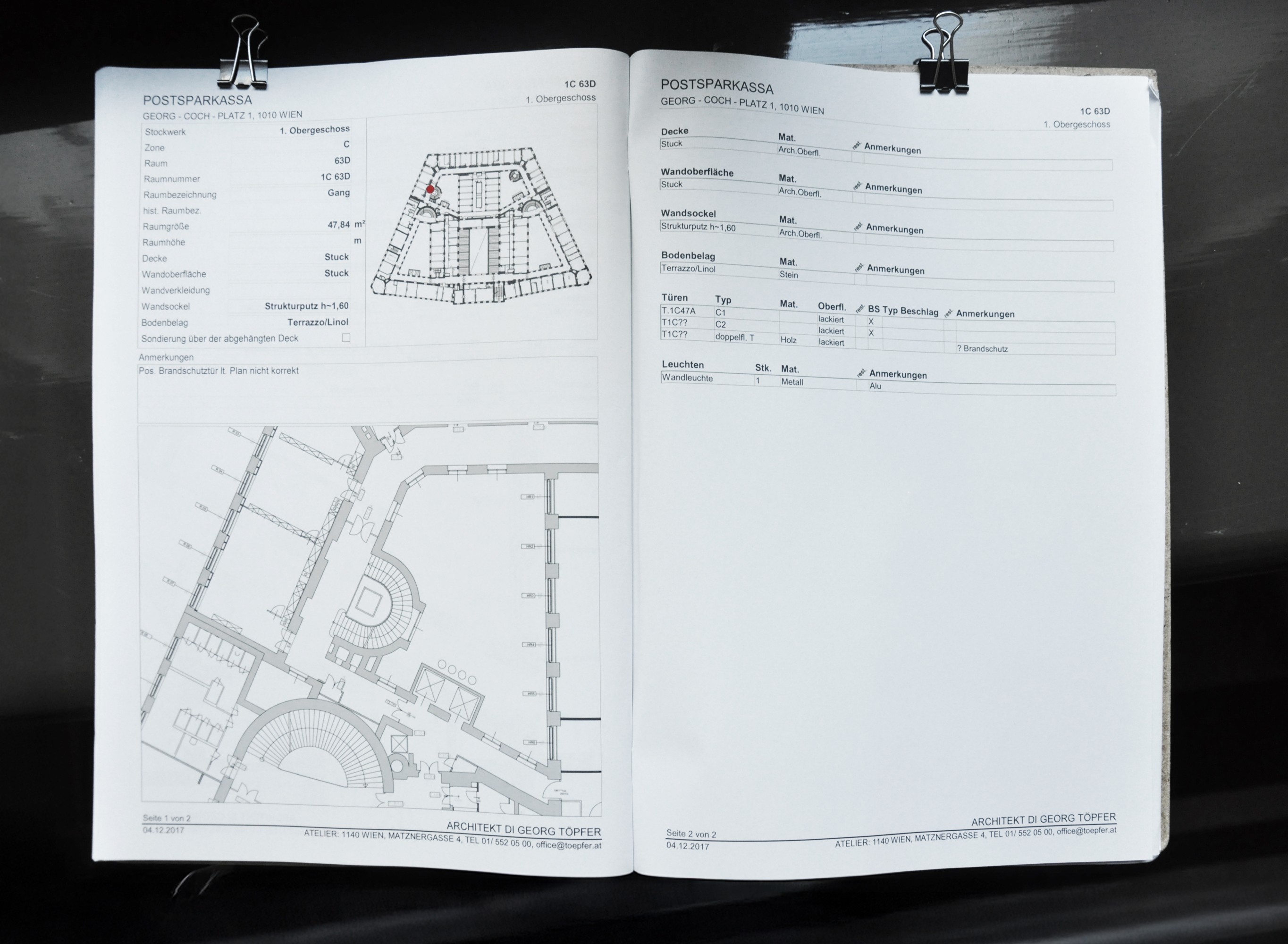 PROJEKTBESCHREIBUNG | Für die Vorbereitung eines umfassenden Sanierungsprojekts wurden umfangreiche Untersuchungen, Befundaufnahmen und ein Raumbuch mit Beschreibung aller vorhandenen Gestaltungselemente erstellt. In weiterer Folge wurden Bemusterungsarbeiten zur Definition von Restaurierzielen für die weiteren Projektphasen erstellt. Im Zuge dieser Bearbeitung wurden Korrosionsschäden an der mit Aluminiumblech verkleideten Stahlunterkonstruktion des Hauptgesimses festgestellt. Nach Entwicklung eines Demontagekonzepts der Hauptgesimskonstruktion erfolgte die Demontage der Natursteinplatten sowie der Zier- und Verkleidungselemente aus Aluminium. Somit konnten Korrosionsschäden an der Stahlkonstruktion des Gesimses begutachtet und entsprechende Sanierungsmaßnahmen durchgeführt werden.