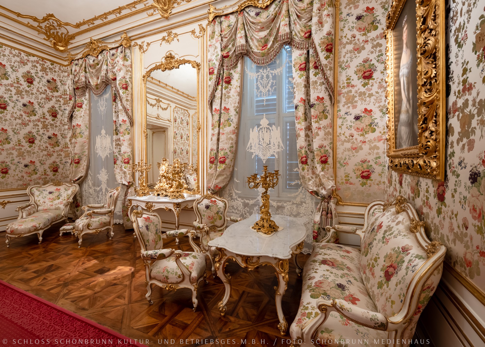 PROJEKTBESCHREIBUNG | Der wesentliche Bestandteil der Restaurierung des Salons der Kaiserin war die Grundlagenforschung seitens der Wissenschaftsabteilung der SKB zur Rekonstruktion der historischen Stoffbespannung für die Erlangung des ursprünglichen Erscheinungsbildes dieses Prunkraumes. Ergänzend wurden an den verbleibenden Wandoberflächen mit Ausführung in Weißgold, der Stuckausstattung des Deckenspiegels und am Tafelparkett konservatorische und restauratorische Maßnahmen durchgeführt.
