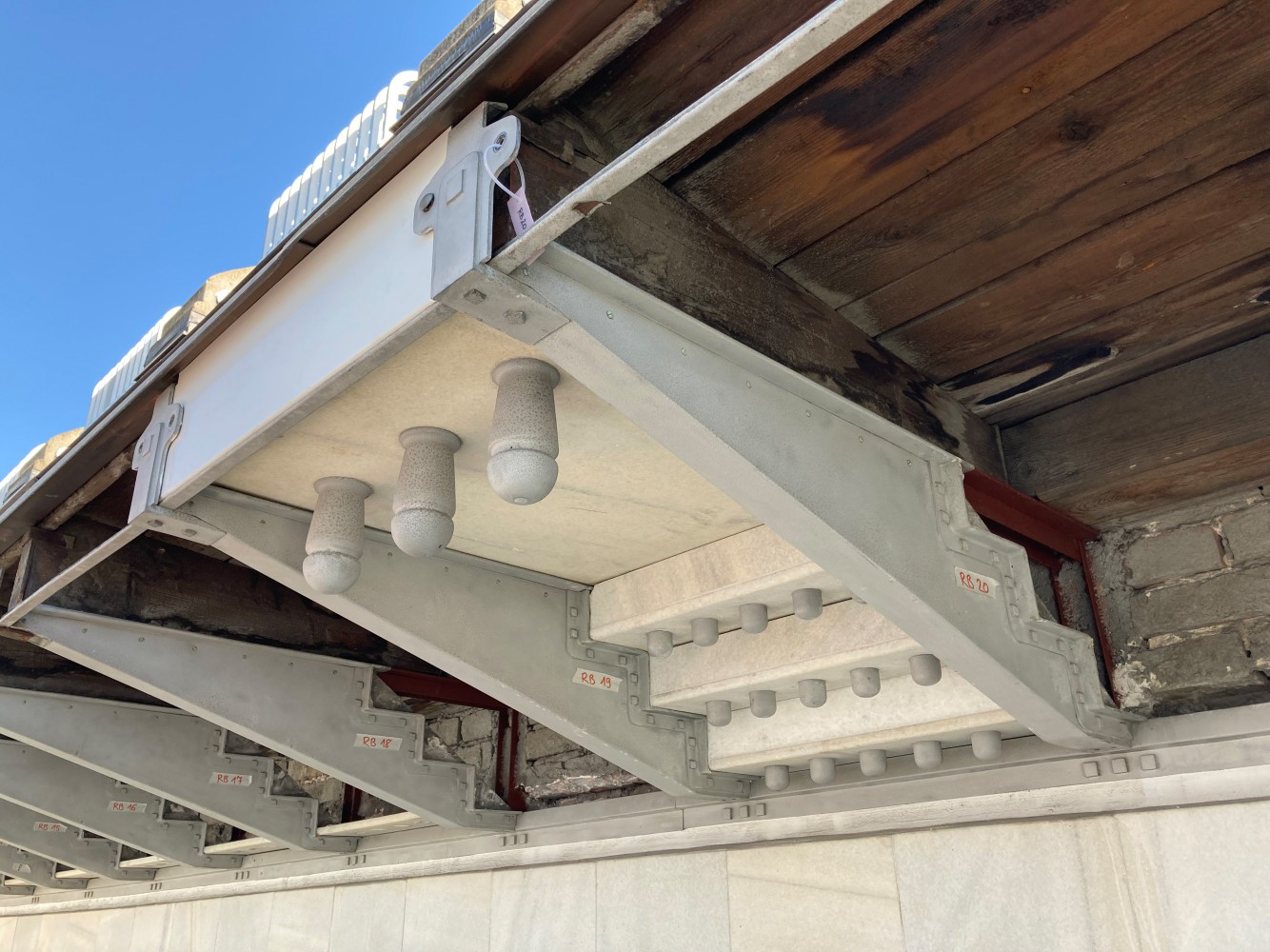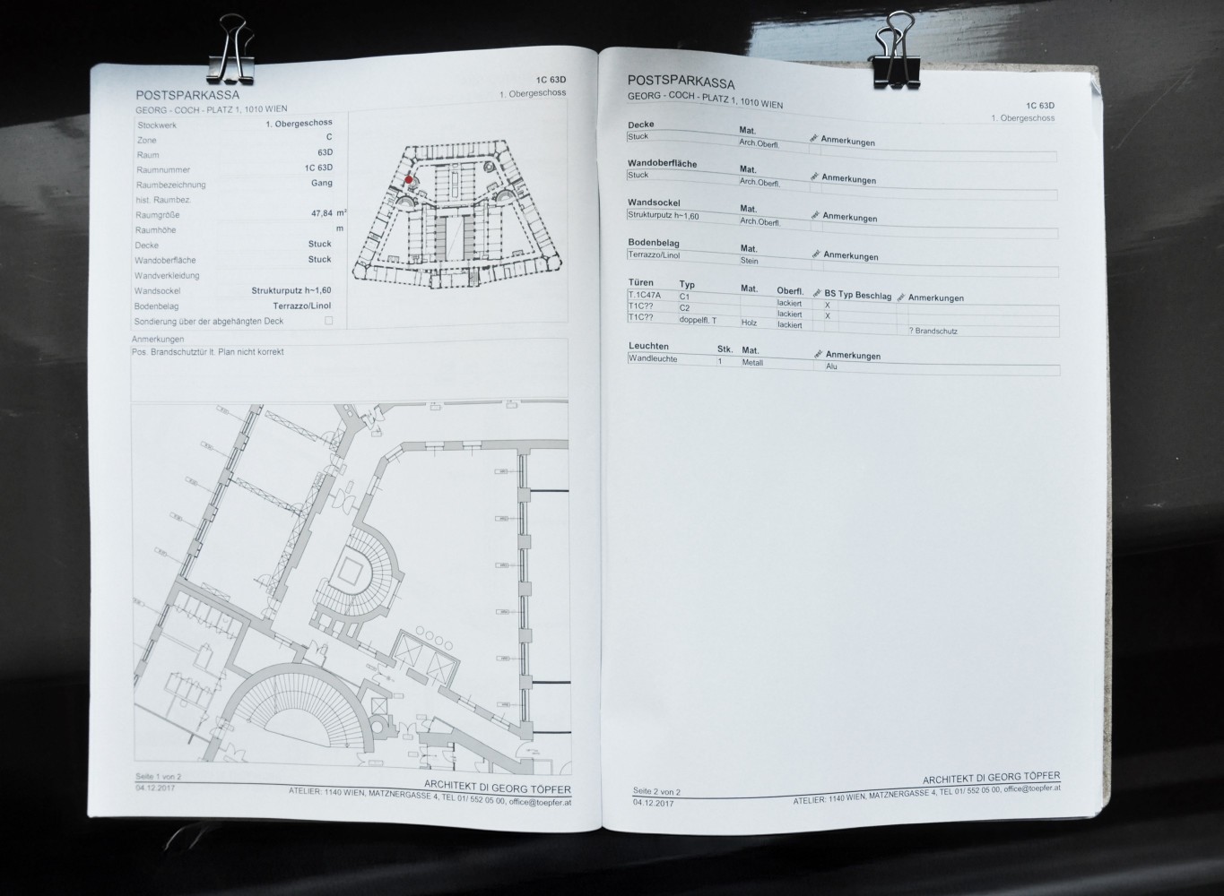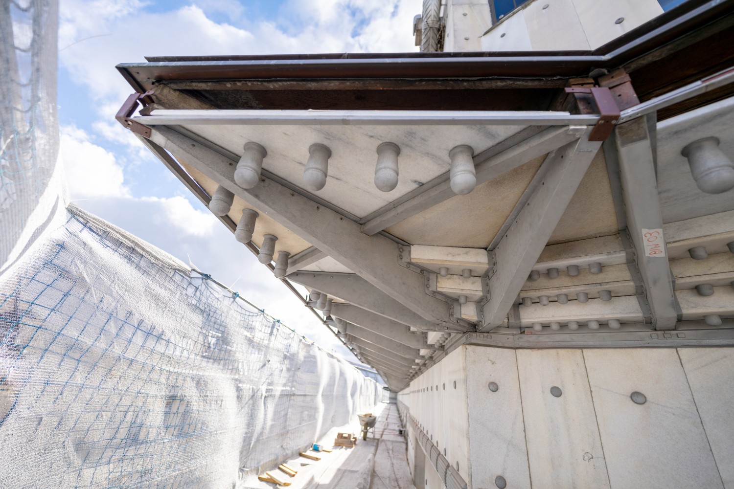 PROJEKTBESCHREIBUNG | Für die Vorbereitung eines umfassenden Sanierungsprojekts wurden umfangreiche Untersuchungen, Befundaufnahmen und ein Raumbuch mit Beschreibung aller vorhandenen Gestaltungselemente erstellt. In weiterer Folge wurden Bemusterungsarbeiten zur Definition von Restaurierzielen für die weiteren Projektphasen erstellt. Im Zuge dieser Bearbeitung wurden Korrosionsschäden an der mit Aluminiumblech verkleideten Stahlunterkonstruktion des Hauptgesimses festgestellt. Nach Entwicklung eines Demontagekonzepts der Hauptgesimskonstruktion erfolgte die Demontage der Natursteinplatten sowie der Zier- und Verkleidungselemente aus Aluminium. Somit konnten Korrosionsschäden an der Stahlkonstruktion des Gesimses begutachtet und entsprechende Sanierungsmaßnahmen durchgeführt werden.